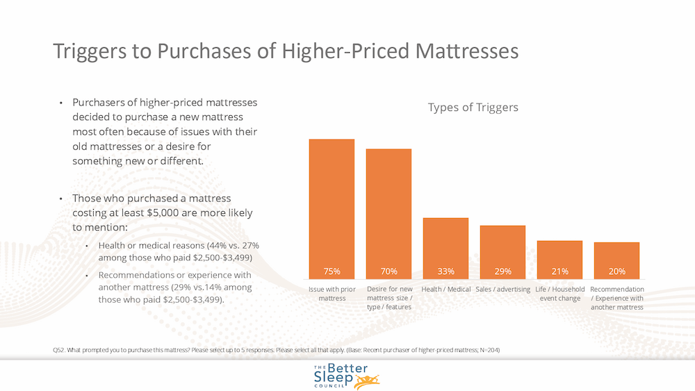 The latest research from the Better Sleep Council, which leads consumer research for the International Sleep Products Association, takes a deep dive into the topic. It compiled answers from an online survey of 500 U.S. adults who had either recently purchased or planned to purchase a mattress that costs $2,500 or more.